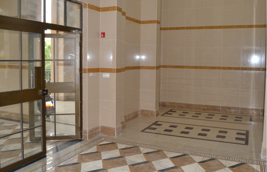 35棟的入戶大門墻面瓷磚閃亮,奢華大氣顯風度,闊景飄窗一片綠色映入眼簾,屋外墻轉格外顯眼。