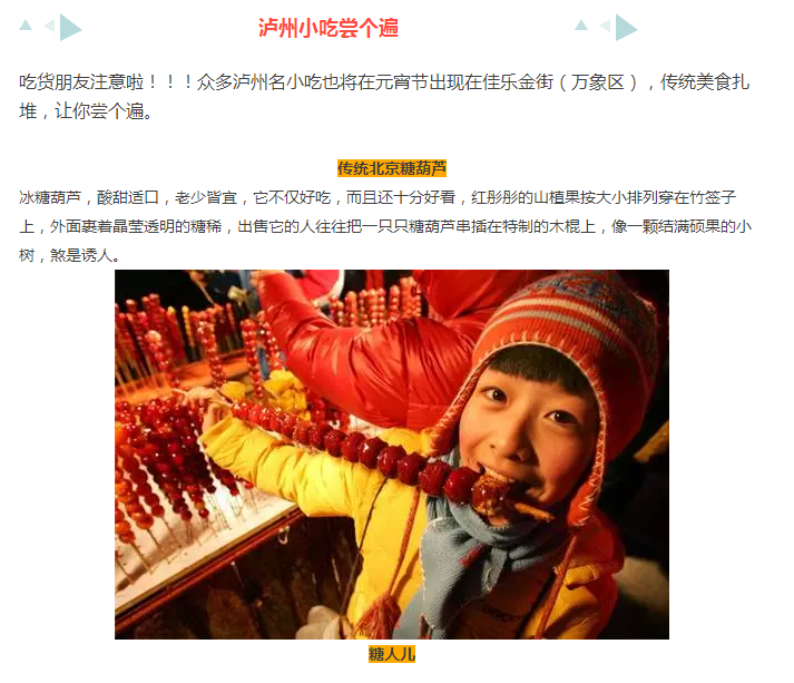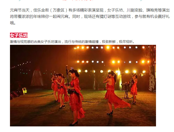 元宵佳節將至,佳樂金街(萬象區)為各位親準備了非常非常豐富的鬧元宵活動,各種表演、趣味游戲、瀘州名小吃、定時抽獎、商家大促,你還在等什么?鬧元宵就到佳樂金街(萬象區)哦!