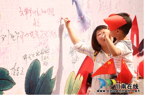 上午11:30分,一道《松花江上》的渾厚男聲在人群中響起,拉開了快閃活動帷幕,路過的人們紛紛駐足觀看,隨后,《保衛黃河》《歌唱祖國》《東方之珠》《七子之歌》《龍的傳人》《世紀的約定》《國家》讓越來越多的路人情不自禁的揮動起雙手,舞動紅旗,一起唱和,并在“愛國大屏幕”上寫上自己的愛國宣言,共同慶祝祖國母親的生日!